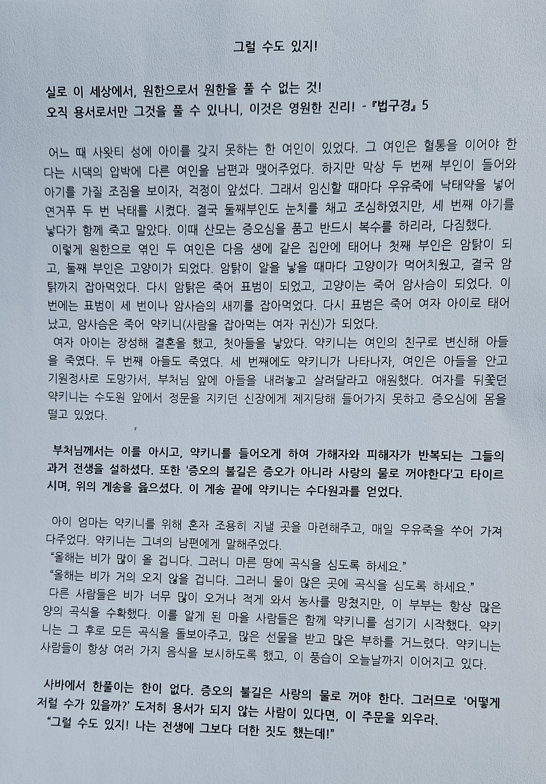 부처님께서는 이를 아시고, 약키니를 들어오게 하여 가해자와 피해자가 반복되는 그들의 과거 전생을 설하셨다. 또한 '증오의 불길은 증오가 아니라 사랑의 물로 꺼야한다'고 타이르시며, 위의 게송을 읊으셨다. 이 게송 긑에 약키니는 수다원과를 얻었다.