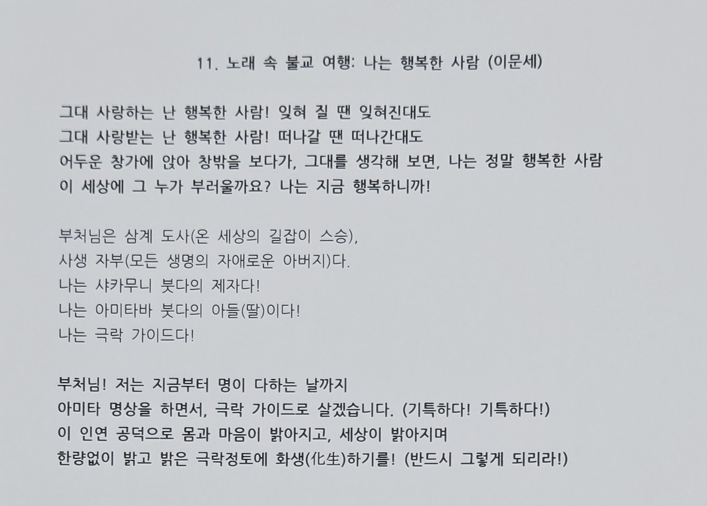 이제라도 법문 듣고 아미따바 부처님을 만났으니, 그 얼마나 다행인가? 통쾌하고 통쾌하지 아니한가? 비록 한 생 수고롭고 힘들어도 잠깐 사이 지나가고, 다음 생에 아미따바 극락정토 태어나면 즐거움이 한량없네. "